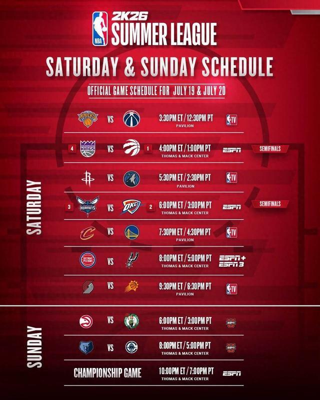 此外,由于夏季联赛冠军将在排名前四的球队中产生,因此老鹰、凯尔特人、灰熊和快船将在周一的决赛日中对冠军发起角逐。详细赛程如下(均为北京时间):